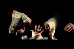Ikusizko eta keinuzko antzerki-ikuskizuna, testurik gabea, gorputz-irudietatik eta objektuetatik abiatuta. Eskuak lehengai sortzaile gisa.