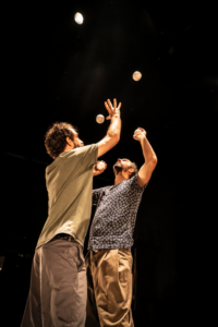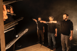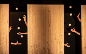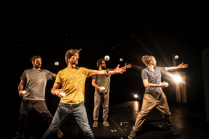 Bost gizon ikusten ditugu eszenan. Normalak dira, eszenatoki batean igota daude. Bakoitza ezberdina eta denak berdinak. Elkarrekin zaintzen, bultzatzen eta ospatzen dira. Labanak botatzen ari dira beren itzalaren kontra, beren buruari begira eta entzuten. Esekidura da airean jaurtitako gure pilota, esekidura-unera iristen dena; dena gerta daitekeen unea, grabitateari amore eman diezaiokegun unea, edo bestelako erabakiak har ditzakegun unea, pilota bat flotatzen geratzen den unea, eta, horrekin batera, eszenatokian denok daukagu arnasa.